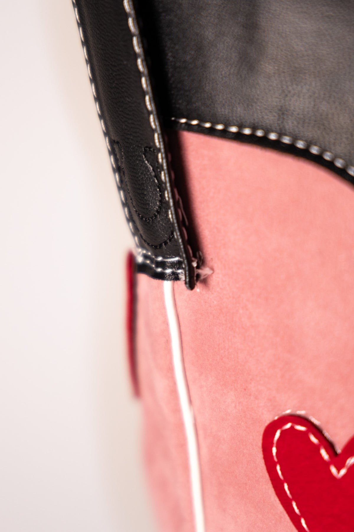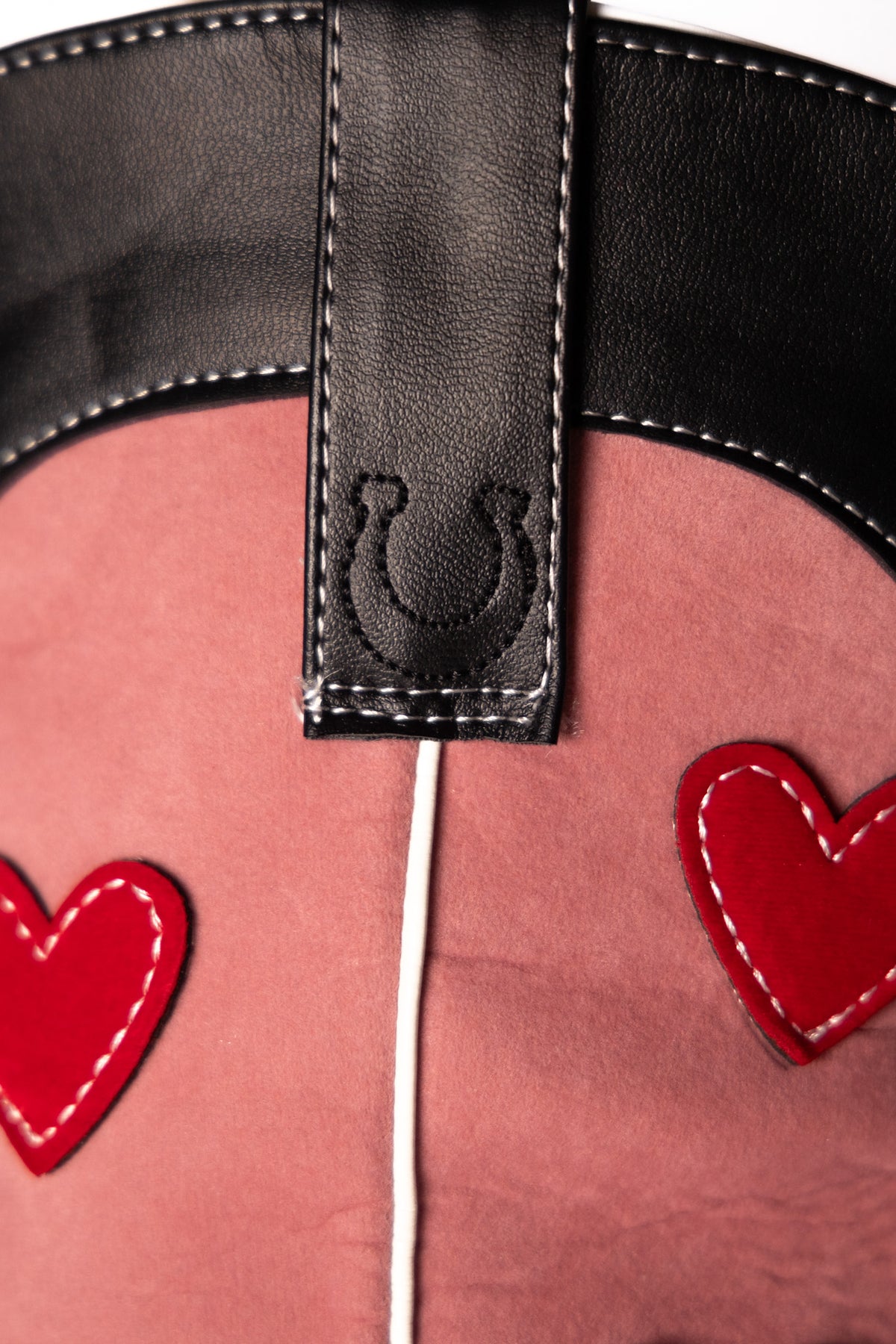 Handcrafted with vegan black leather and a pop of pink vegan suede, these custom cowboy boots will have you two-stepping in no time. And don't overlook the red velvet hearts - because these boots were made for walking, and for turning heads. Yee-haw!