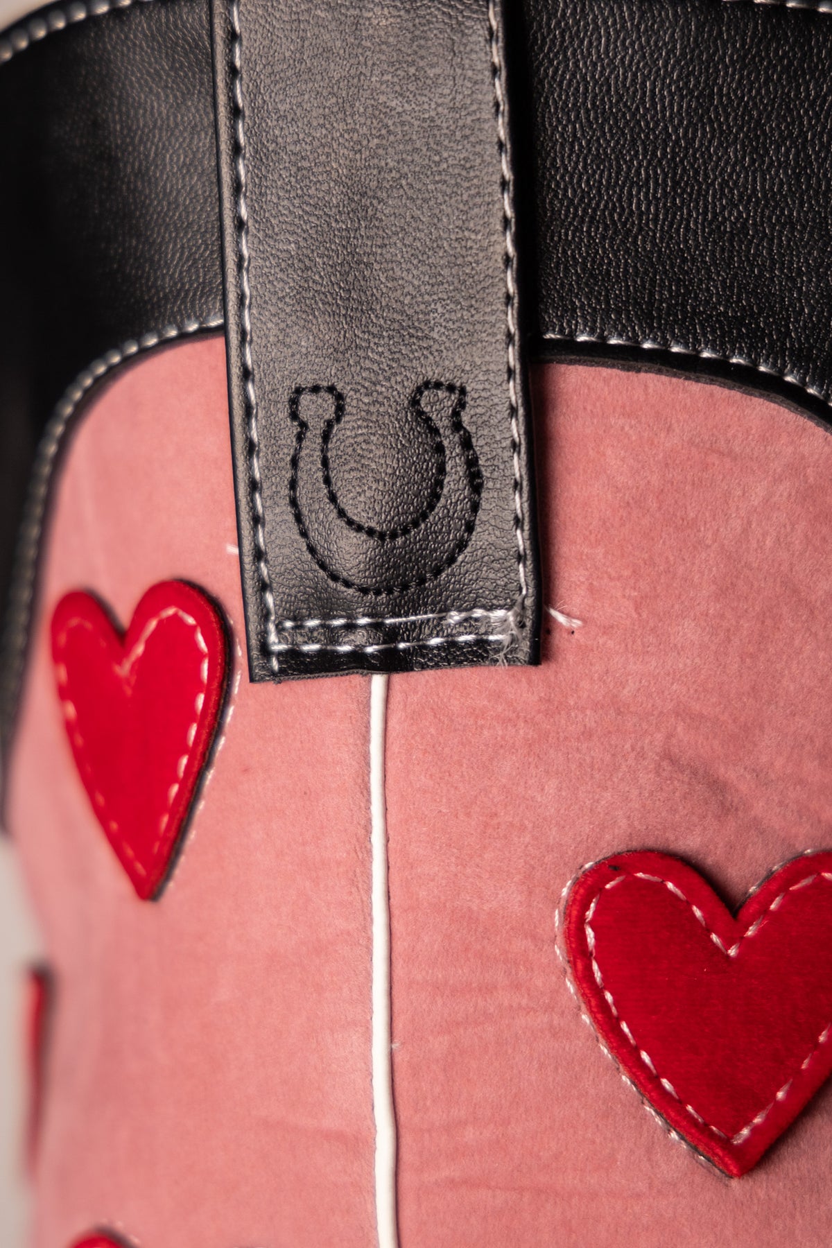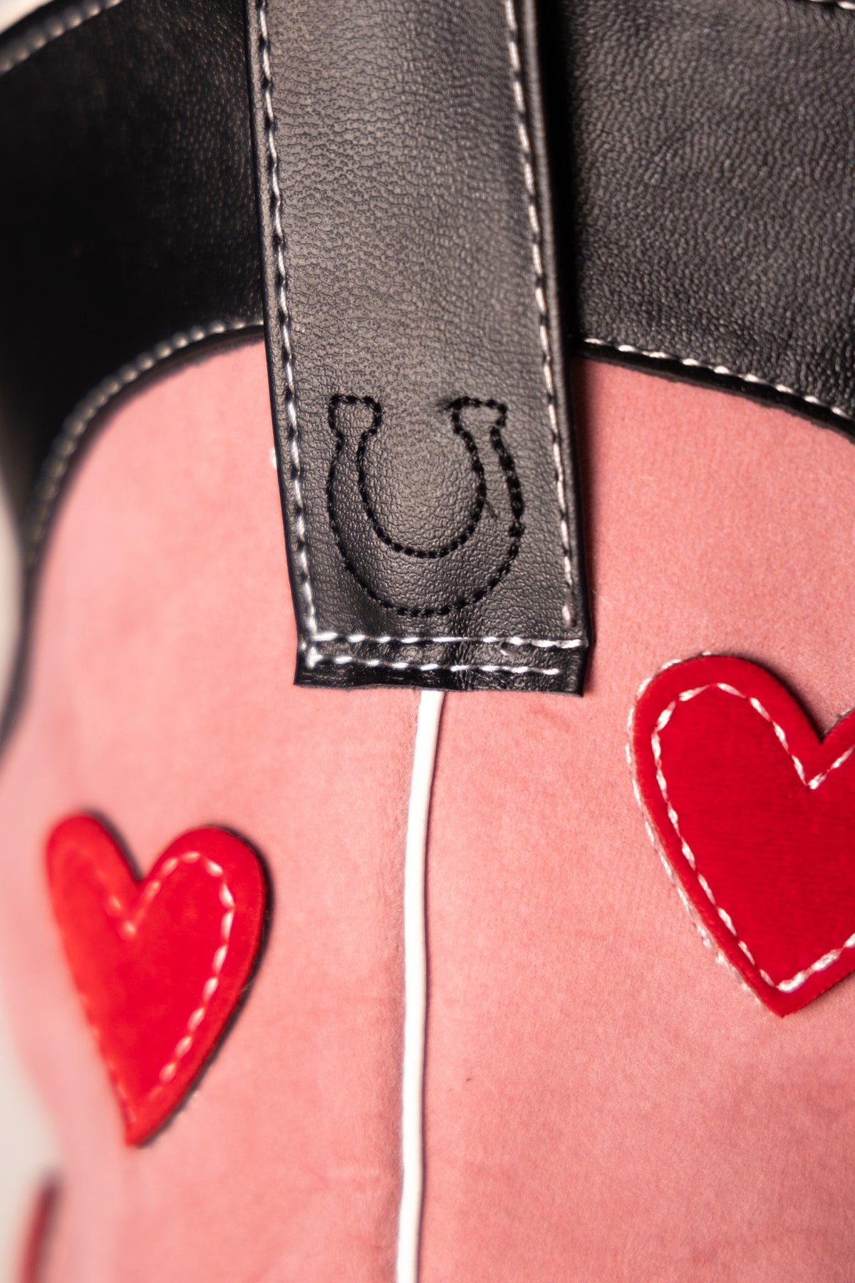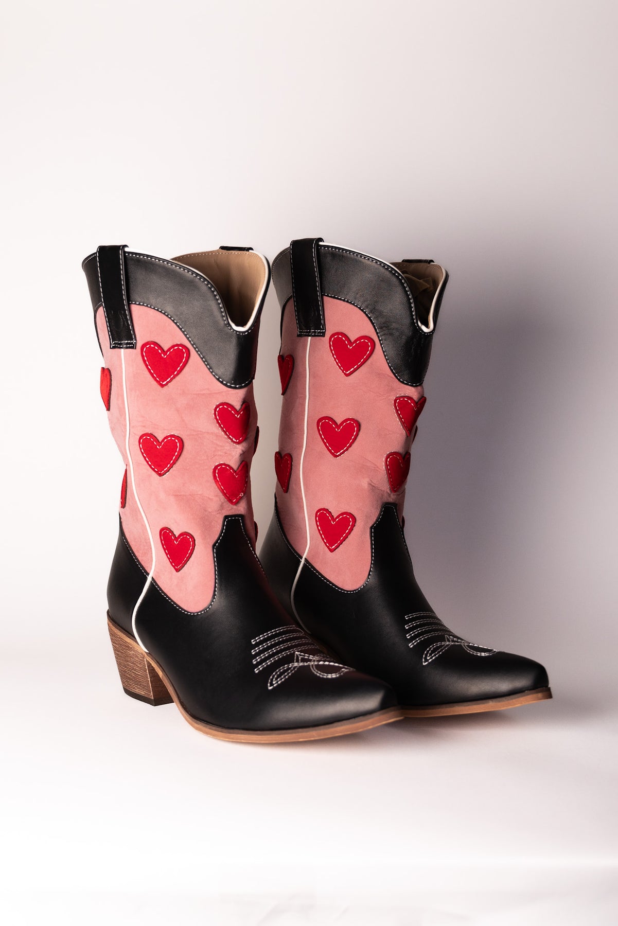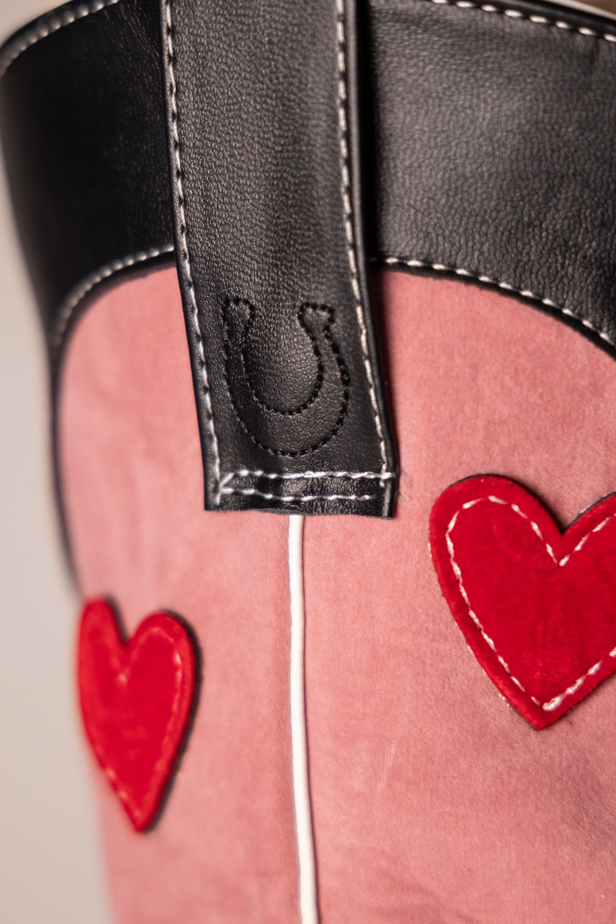 Handcrafted with vegan black leather and a pop of pink vegan suede, these custom cowboy boots will have you two-stepping in no time. And don't overlook the red velvet hearts - because these boots were made for walking, and for turning heads. Yee-haw!