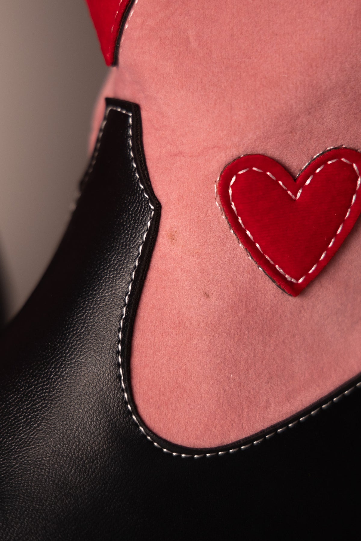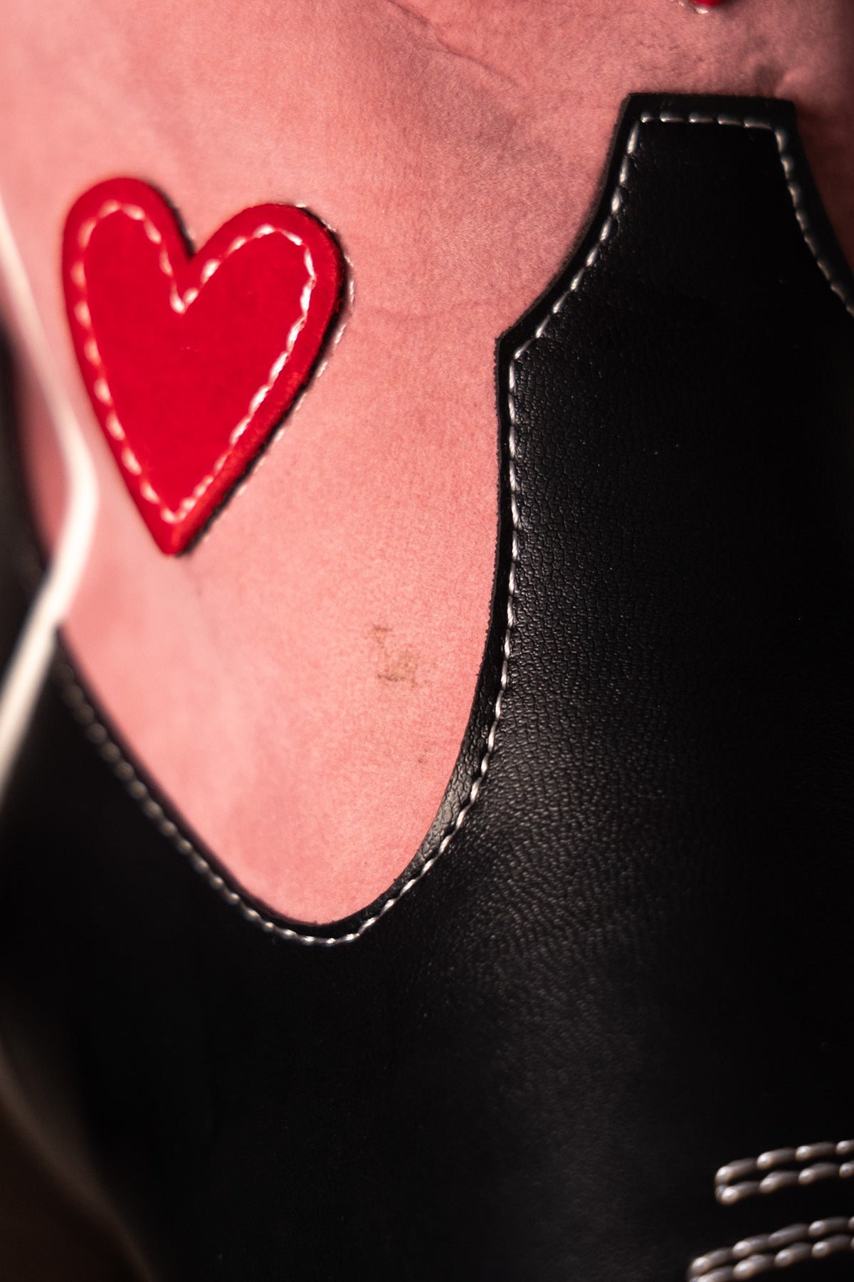 Handcrafted with vegan black leather and a pop of pink vegan suede, these custom cowboy boots will have you two-stepping in no time. And don't overlook the red velvet hearts - because these boots were made for walking, and for turning heads. Yee-haw!