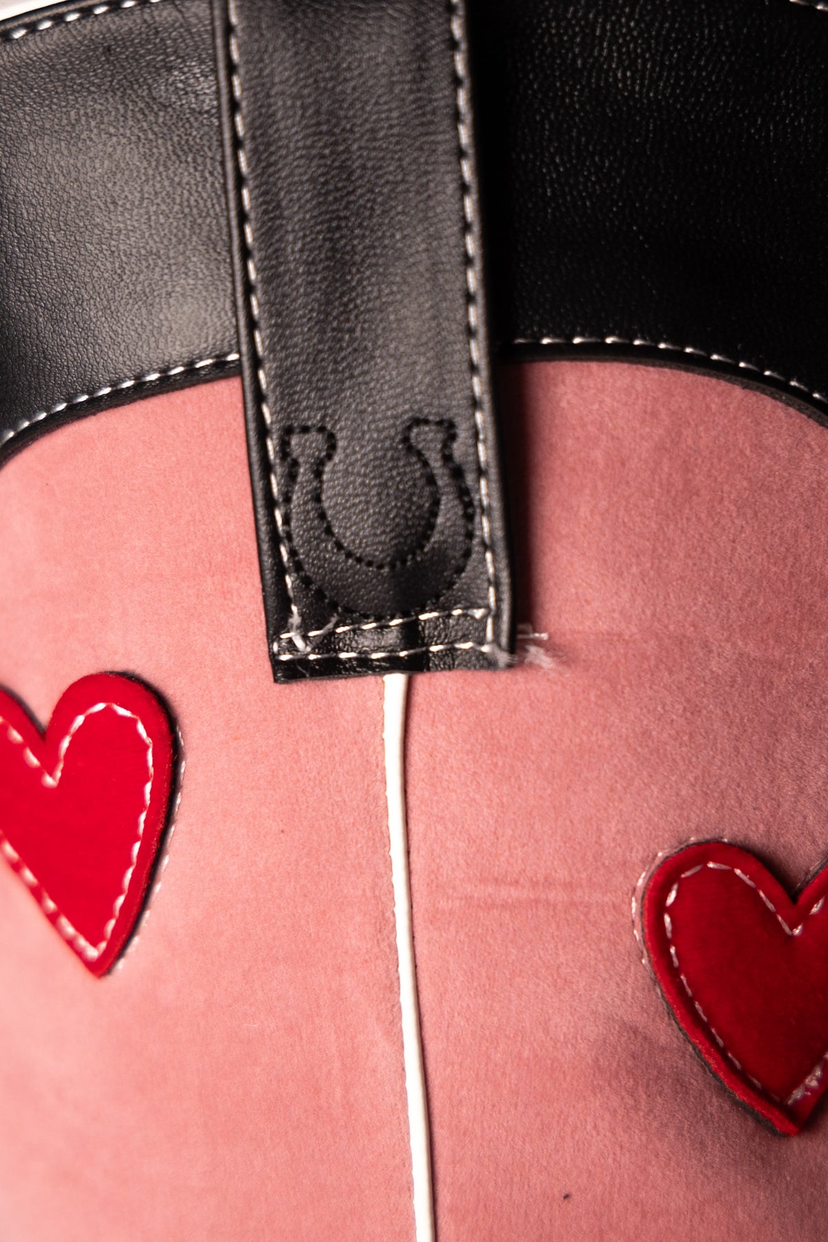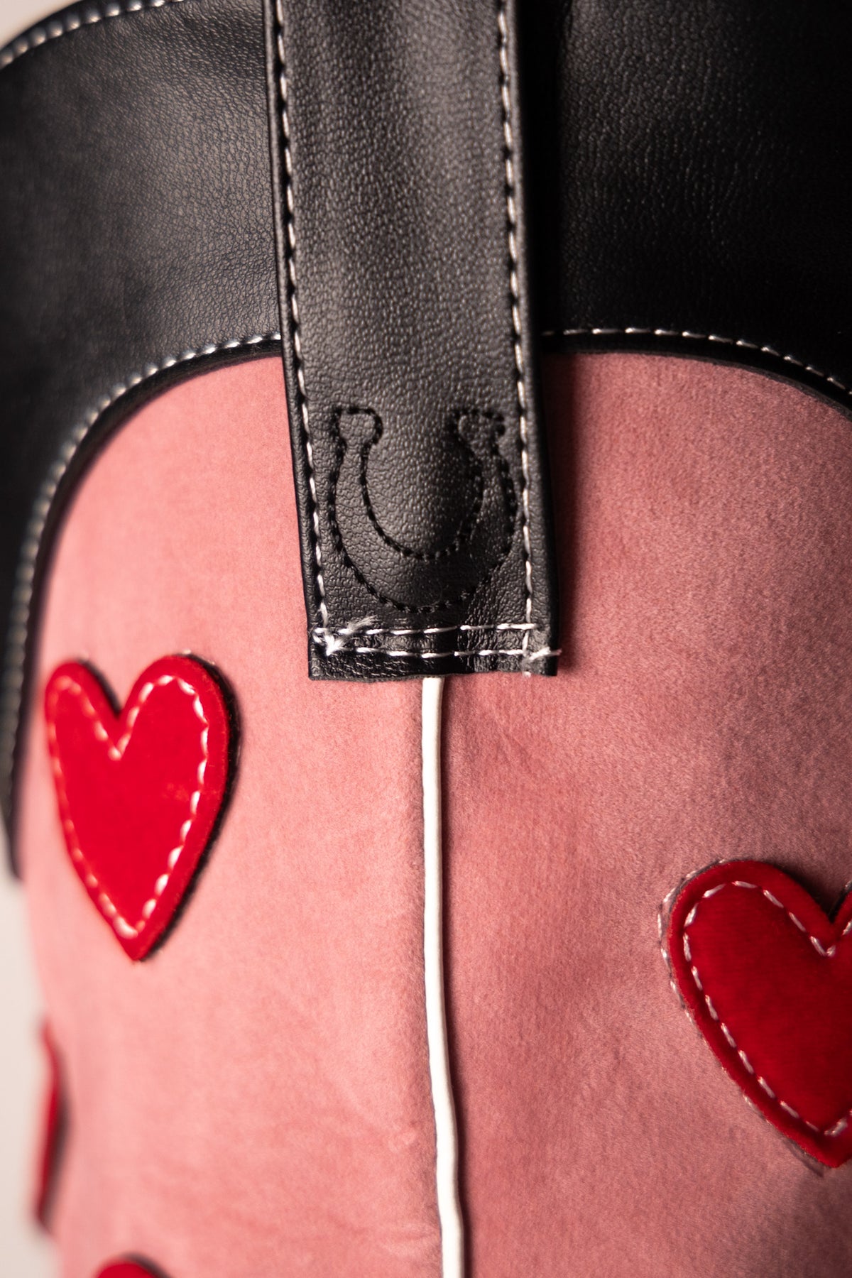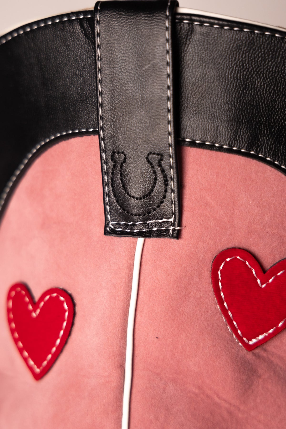 Handcrafted with vegan black leather and a pop of pink vegan suede, these custom cowboy boots will have you two-stepping in no time. And don't overlook the red velvet hearts - because these boots were made for walking, and for turning heads. Yee-haw!
