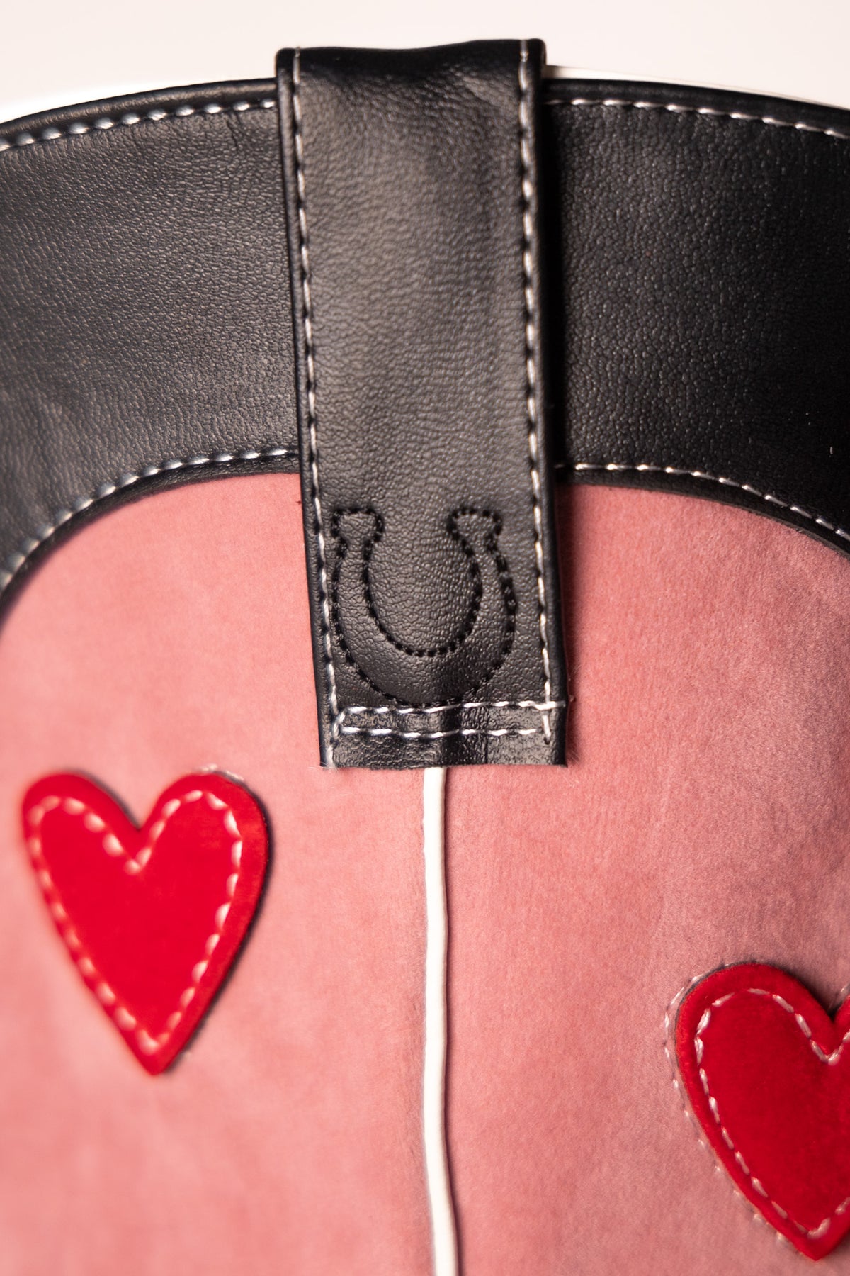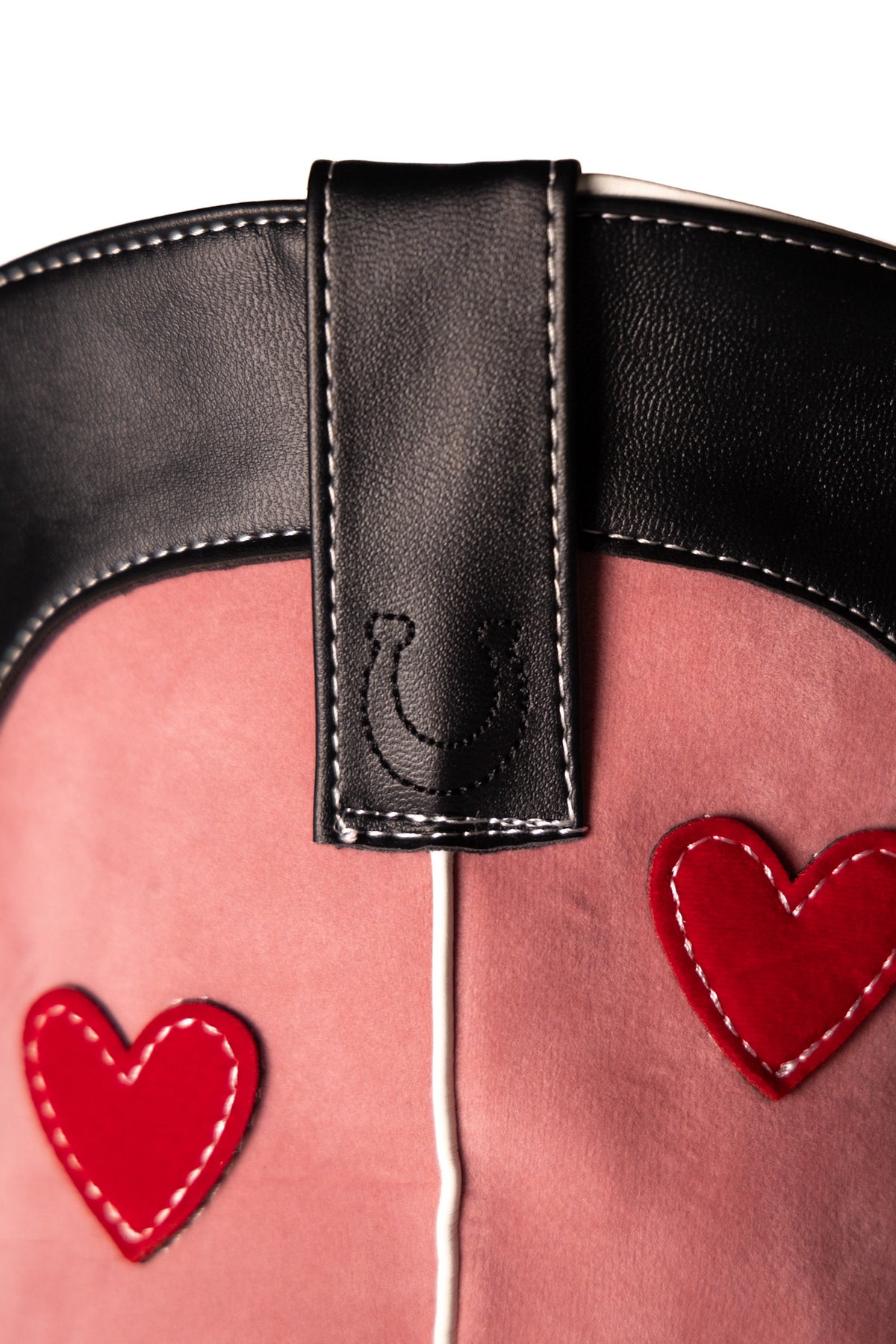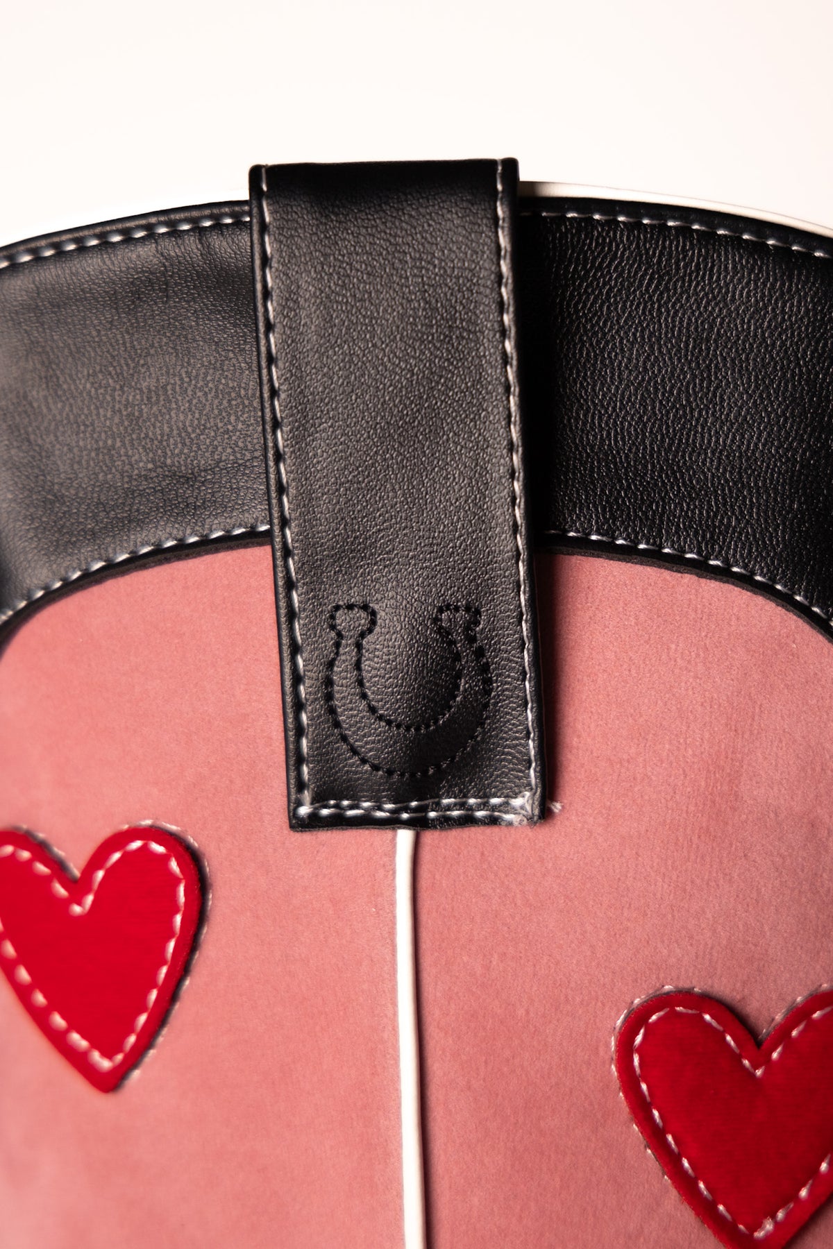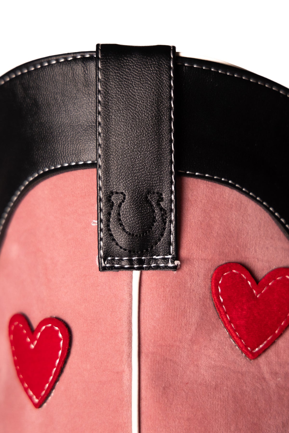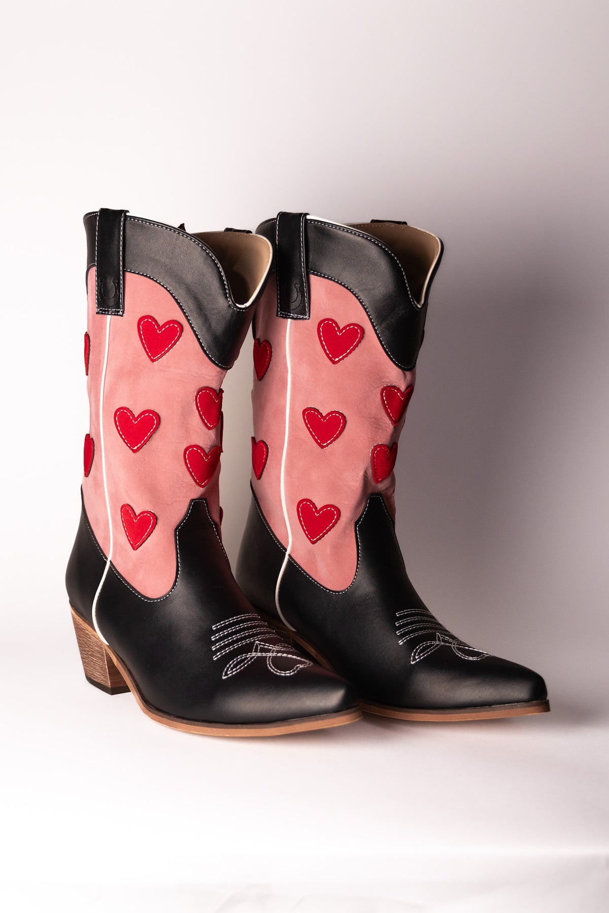 Handcrafted with vegan black leather and a pop of pink vegan suede, these custom cowboy boots will have you two-stepping in no time. And don't overlook the red velvet hearts - because these boots were made for walking, and for turning heads. Yee-haw!