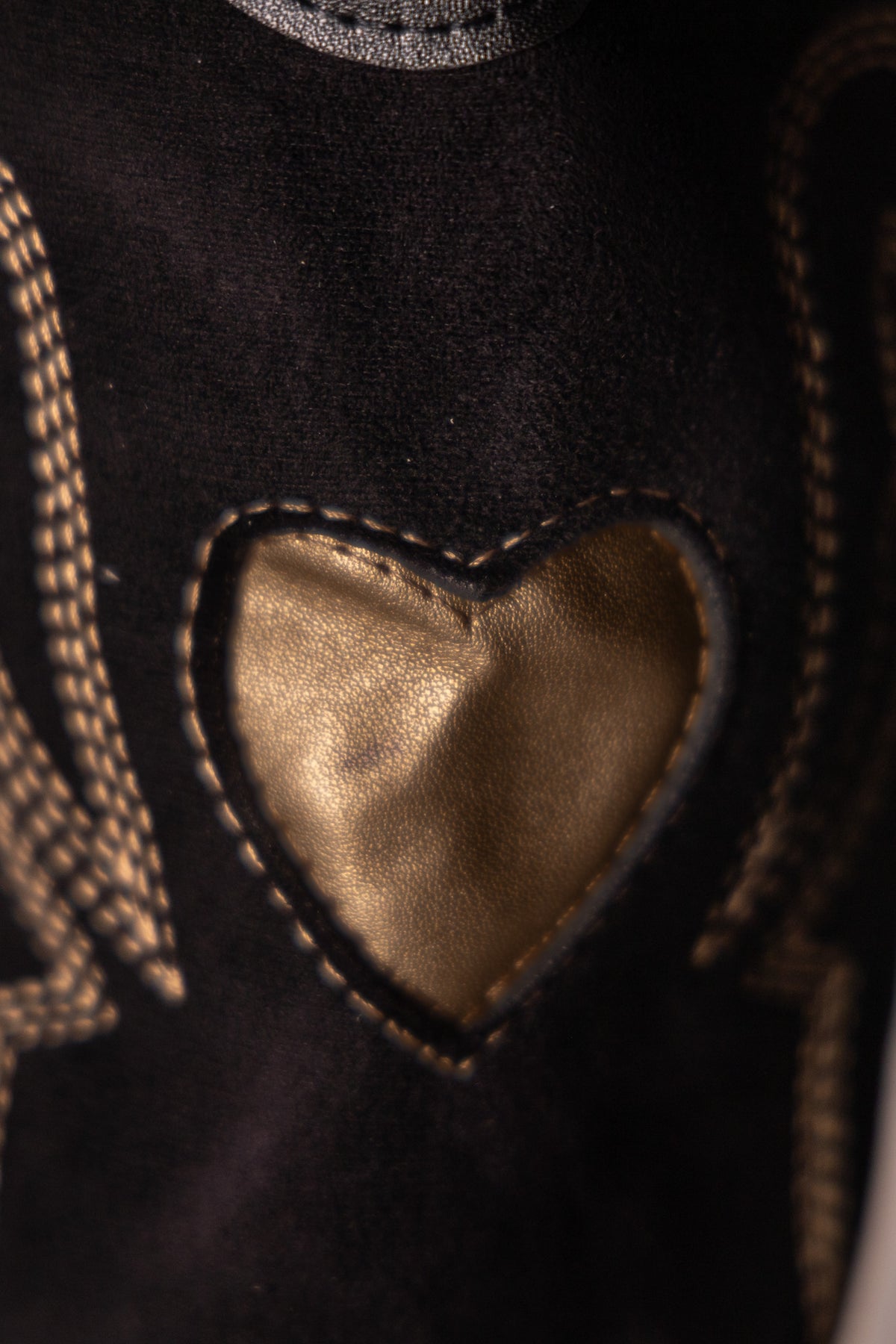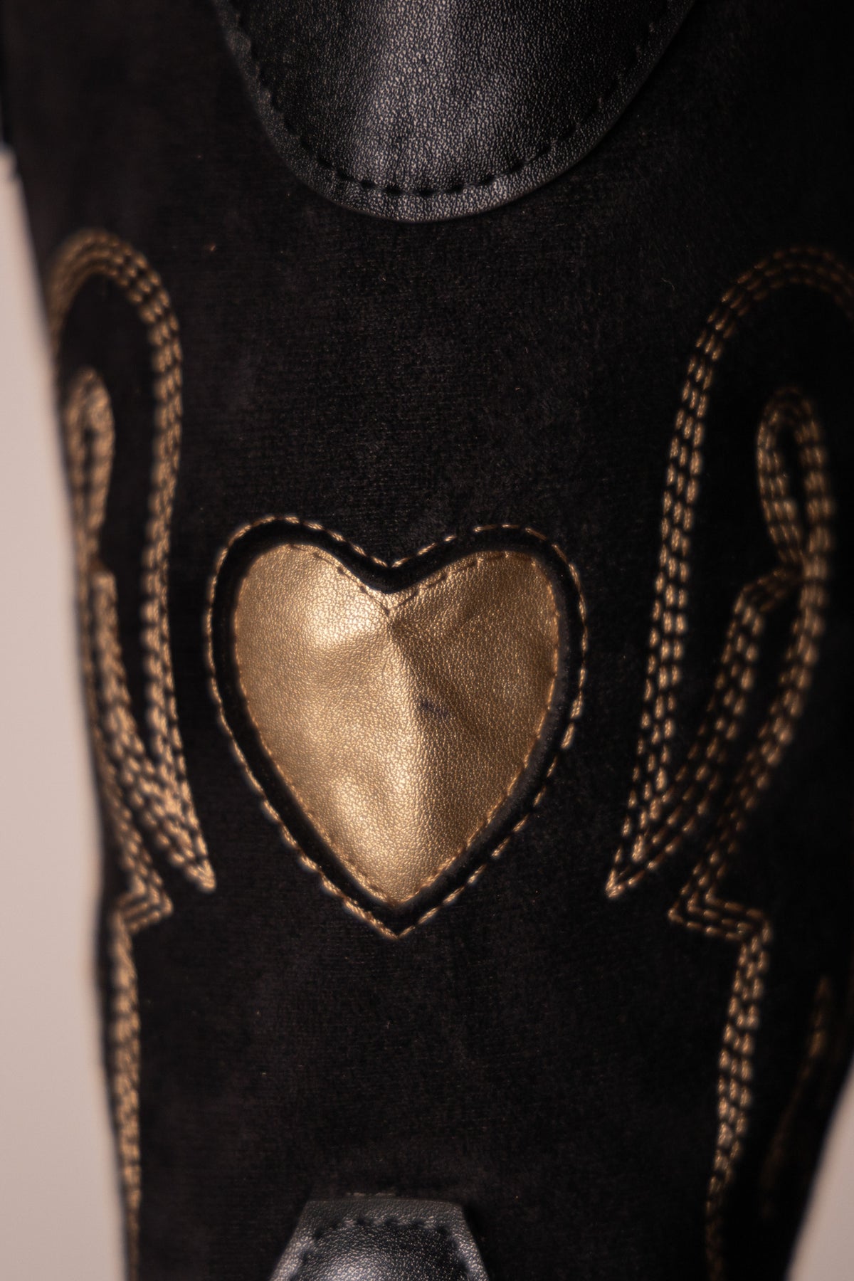 Made with black vegan, imitation leather and suede, these cowboy boots feature a gold heart on the front and the back and gold stitch detailing, with The Lucky Cowgirl Club’s signature, custom heart toe stitch pattern and the embroidered Lucky Horseshoe on the pull tabs.
