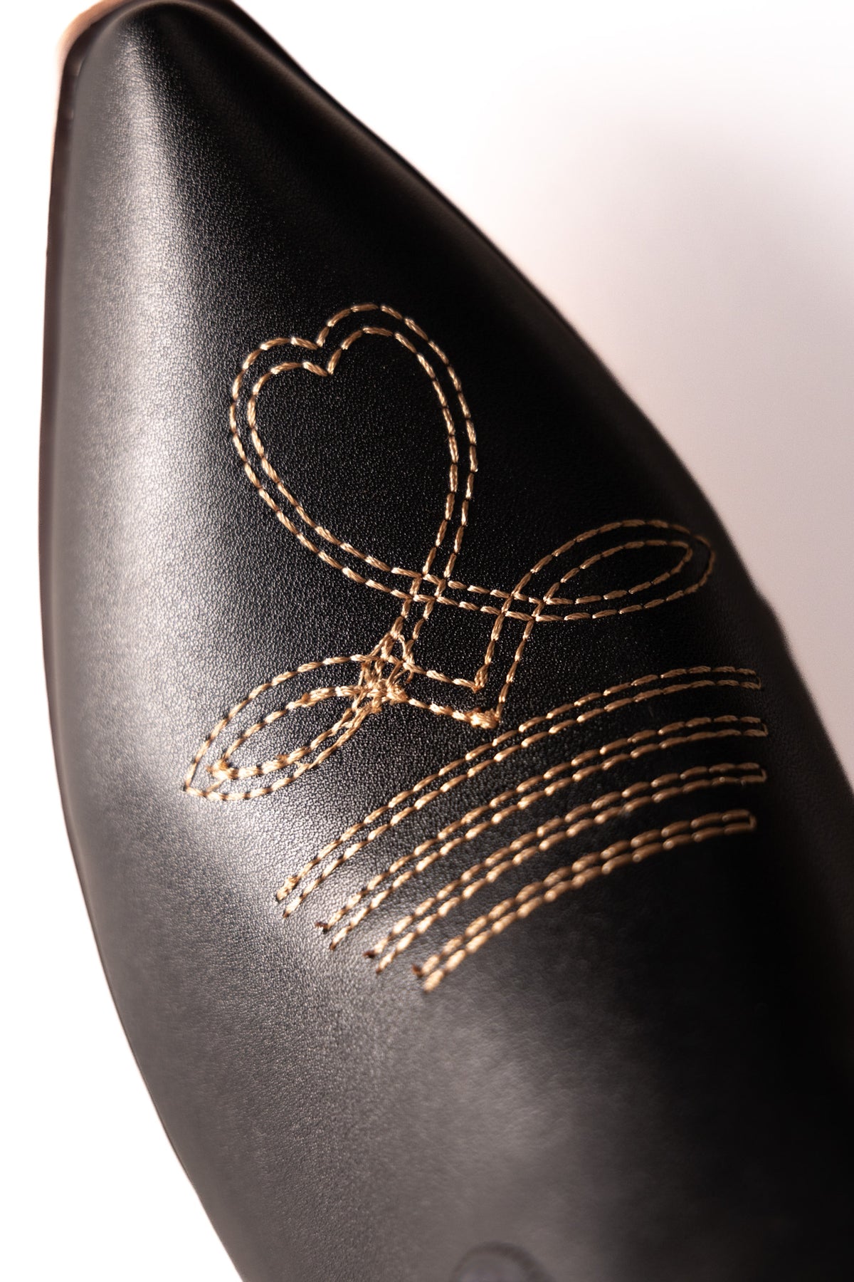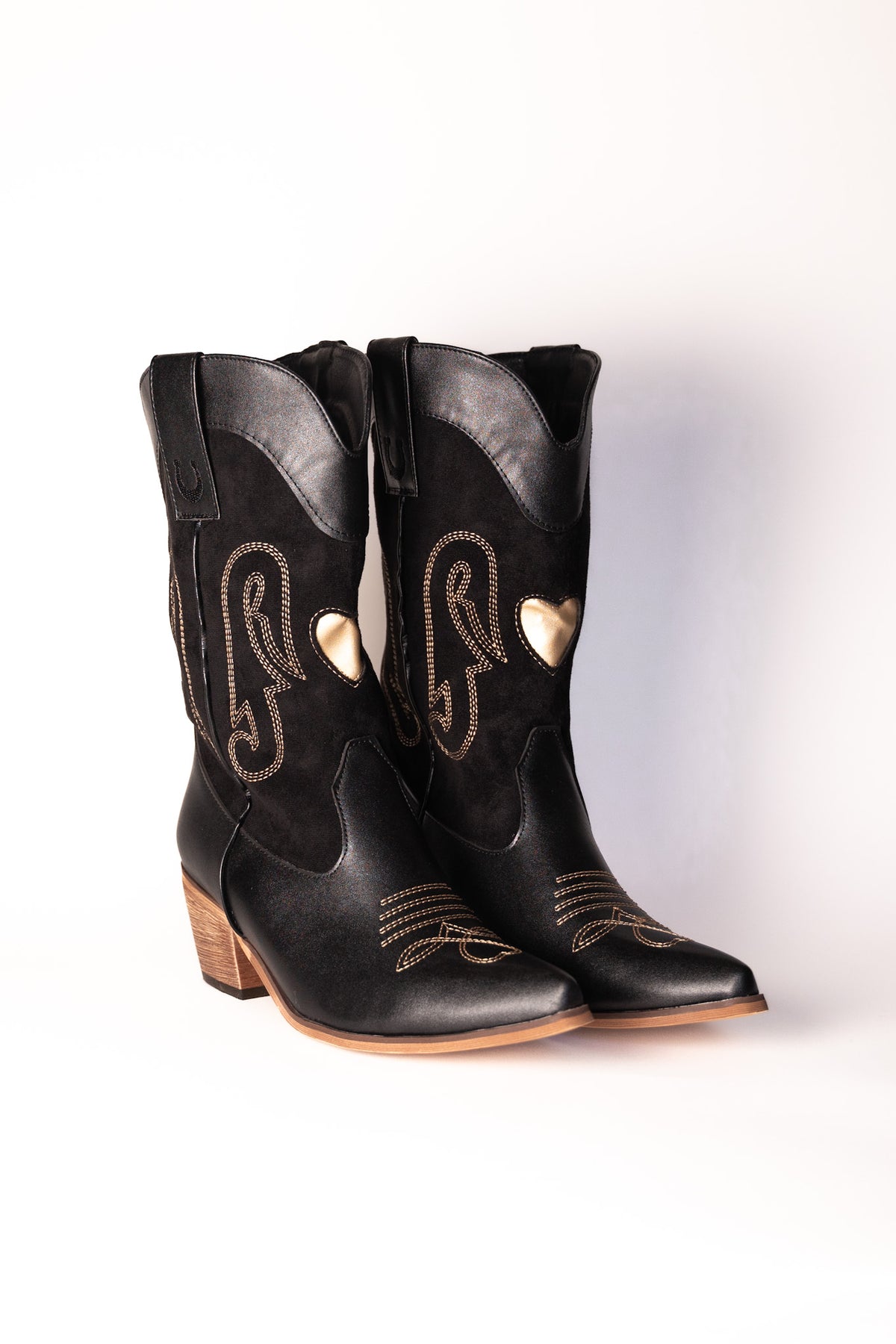 Made with black vegan, imitation leather and suede, these cowboy boots feature a gold heart on the front and the back and gold stitch detailing, with The Lucky Cowgirl Club’s signature, custom heart toe stitch pattern and the embroidered Lucky Horseshoe on the pull tabs.